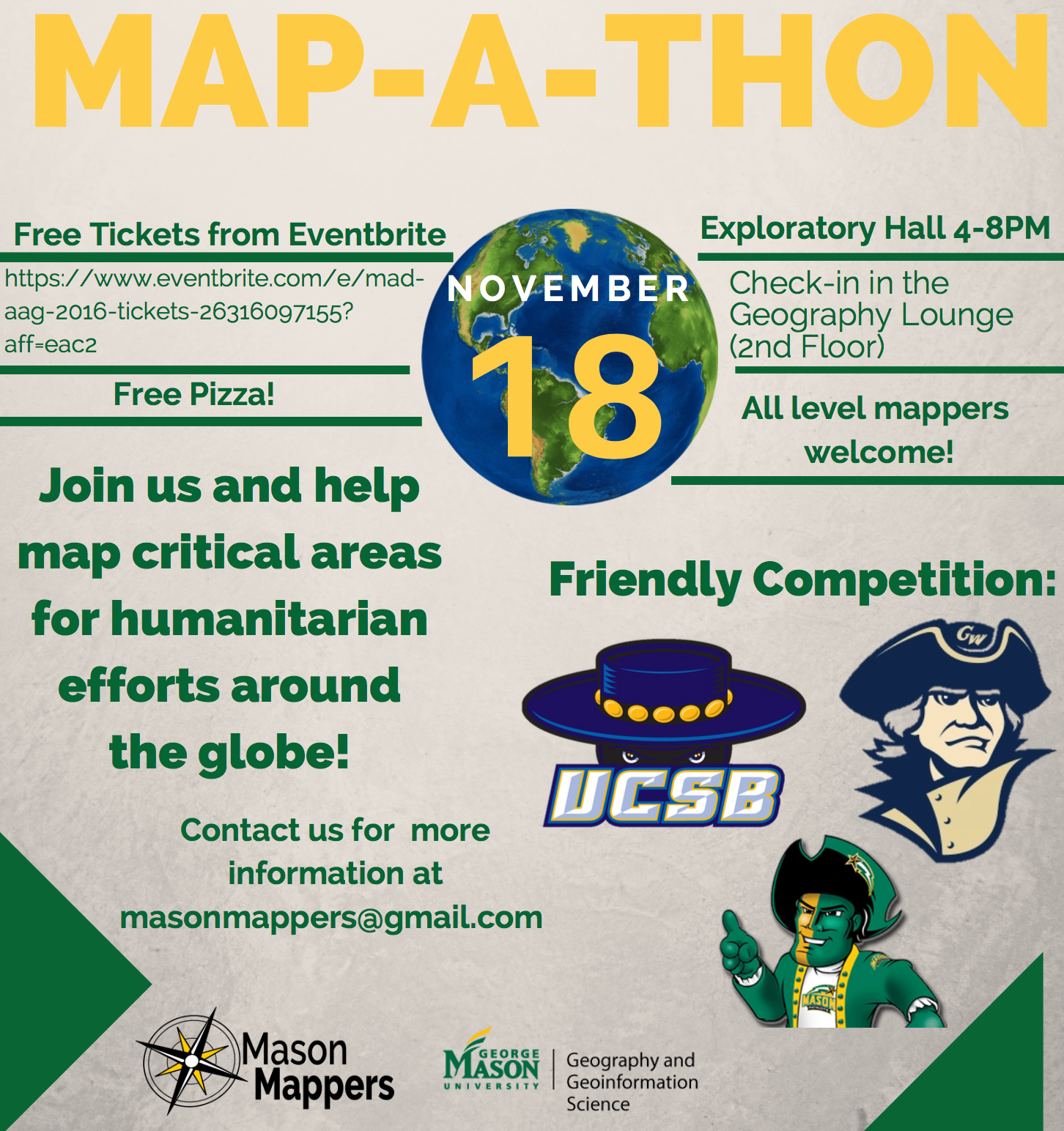 On Friday, November 18th, George Mason University’s Mason Mappers and Geography and Geoinformation Department will host a Mapathon where mappers will choose from various impactful mapping projects that create open data to help the humanitarian and development community. Come show your Patriot Pride from 4:00 pm to 8:00 pm in Exploratory Hall, 2301